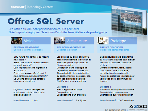 Cet accord permet à des clients de venir au MTC pour la réalisation de Proof-Of-Concept ou de validation technique comme par exemple évaluer une migration vers SQL Azure, dessiner l’architecture d’un Data Center ou encore de réaliser un prototype de Business Intelligence avec Power View et les modèles tabulaires.